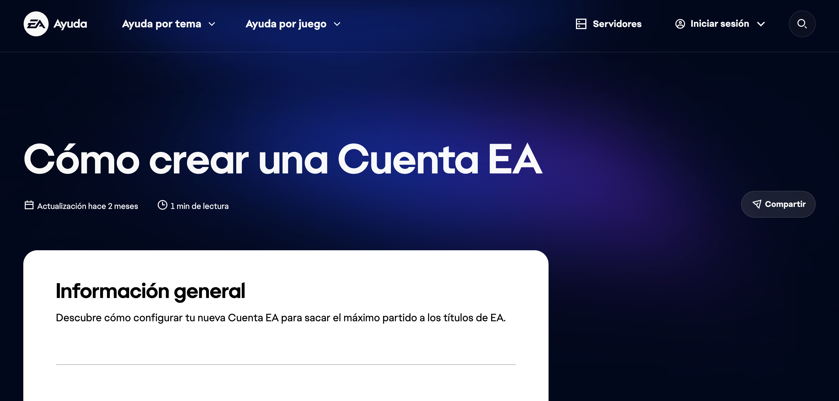 ¿Cómo creo una cuenta EA?Actualizado 6 days agoPara crear tu cuenta en EA, visita su sitio web con las indicaciones a seguir. ¿Este artículo ha sido de ayuda? SíNo