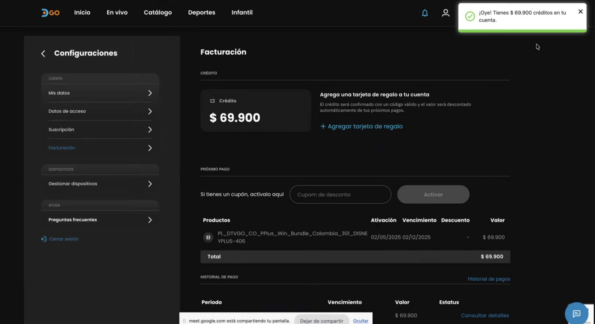 Una vez aplicado el saldo, tu cuenta quedará actualizada con los servicios incluidos.